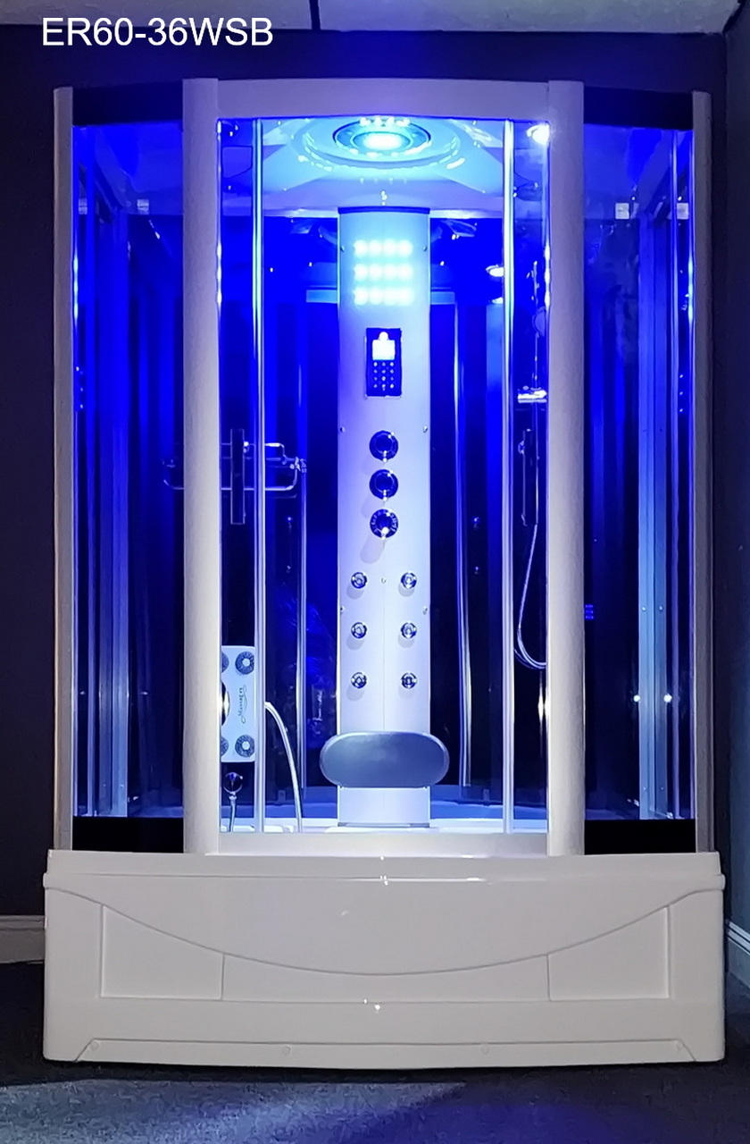 This EmpireShower R60-36WSB-HD beautiful rectangular shaped free-standing shower/bathtub combo is a little spa in your own home. It is packed with everything you need for complete relaxation after a long day and will give you one of the best shower experiences of your life. Not only does it come with a comfortable headrest, ultra-quick heating steam generator with aromatherapy, multiple body massage jets, foot massage, but it also comes with a state of the art computerized control panel with Bluetooth playback and speakerphone. Nothing will alleviate the stresses of your day like bathing in this shower.