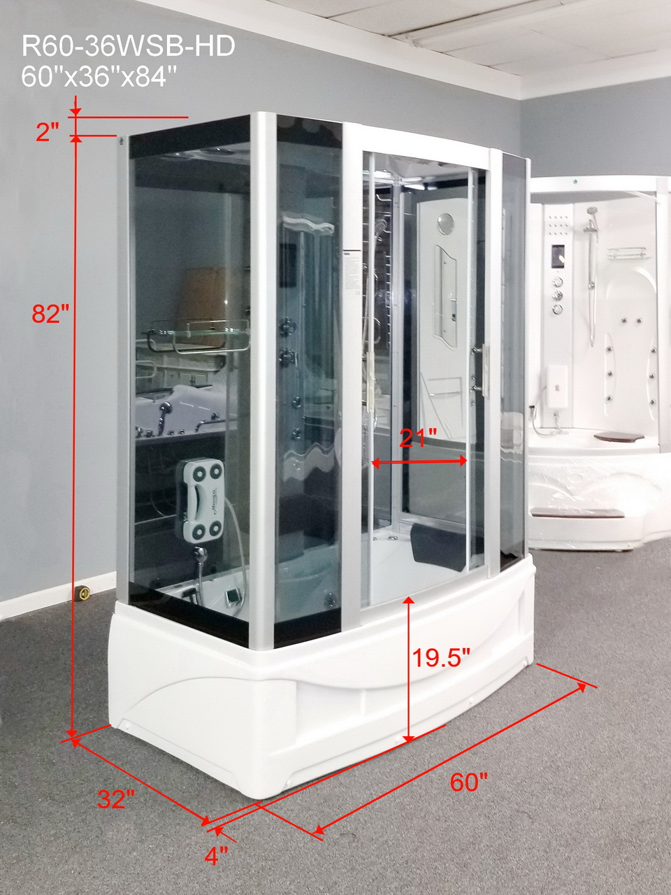 This EmpireShower R60-36WSB-HD beautiful rectangular shaped free-standing shower/bathtub combo is a little spa in your own home. It is packed with everything you need for complete relaxation after a long day and will give you one of the best shower experiences of your life. Not only does it come with a comfortable headrest, ultra-quick heating steam generator with aromatherapy, multiple body massage jets, foot massage, but it also comes with a state of the art computerized control panel with Bluetooth playback and speakerphone. Nothing will alleviate the stresses of your day like bathing in this shower.